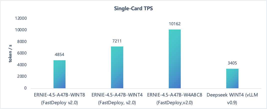 FastDeploy supports weight-only 4-bit inference, enabling deployment with as few as 4 GPUs while maintaining near-lossless accuracy. When deploying ERNIE-4.5-300B-A47B model on a single-GPU, it delivers approximately 23% higher QPS compared to full-weight 8-bit inference, reducing hardware requirements and improving efficiency at the same time. To further optimize MoE quantization, FastDeploy introduces W4A8 quantization along with 8-bit compression for KV cache, resulting in an additional ~40% QPS gain. On a single H800 GPU, the achieved TPS outperforms the 8-GPU vLLM deployment of WINT4 DeepSeek by 198%.